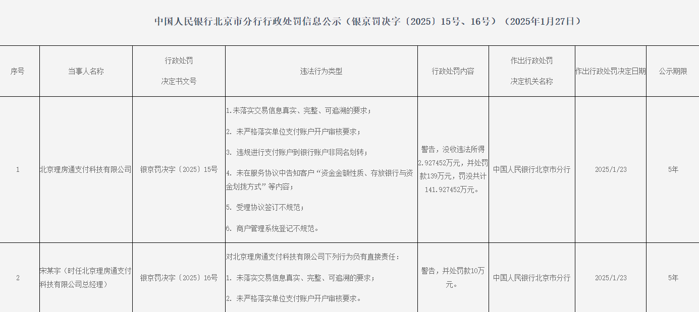 北京理房通支付科技有限公司因6项违法行径,被告诫,充公违法所得2.927452万元,并处罚金139万元,罚没统共141.927452万元。罚单触及违法行径类型如下:1.未落实交游信息真正、完满、可追念的条目;2. 未严格落实单元支付账户开户审核条目;3. 违法进行支付账户到银行账户非同名划转;4. 未在办事合同中文牍客户“资金金额性质、存放银行与资金划拨模式”等实践;5. 受理合同订立不程序;6. 商户束缚系统登记不程序。