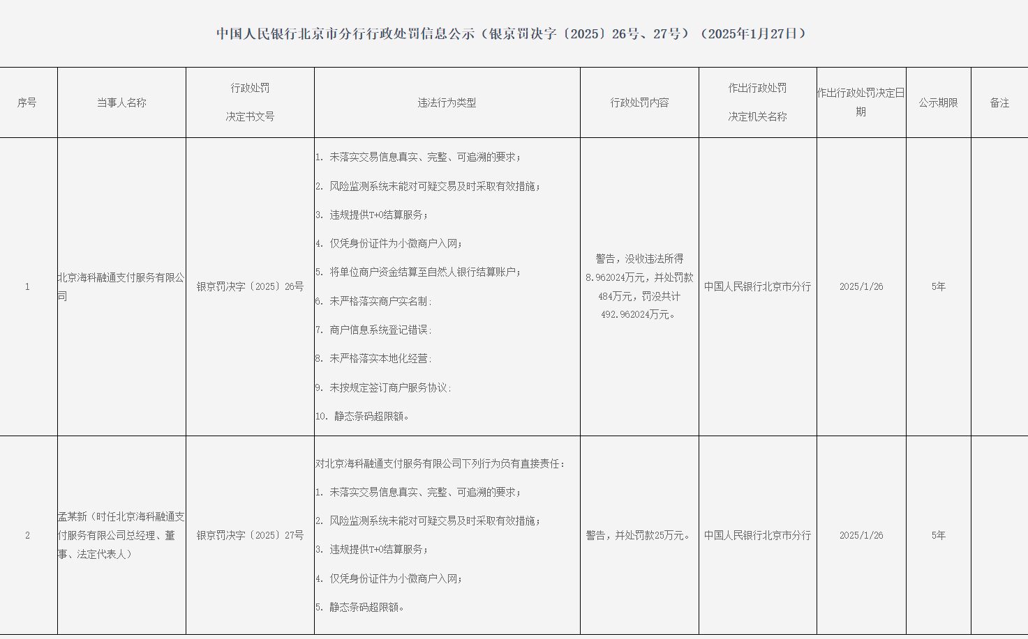 孟某新(时任北京海科融通支付办事有限公司总司理、董事、法定代表东谈主)对北京海科融通支付办事有限公司5项违法行径负有胜仗牵累,被告诫,并处罚金25万元。