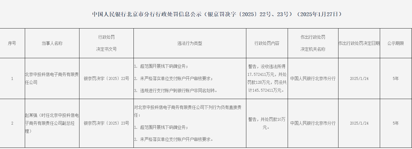北京中投科信电子商务有限牵累公司因超限度开展线下码牌业务;未严格落实单元支付账户开户审核条目;违法进行支付账户到银行账户非同名划转,被告诫,充公违法所得17.572411万元,并处罚金128万元,罚没统共145.572411万元。