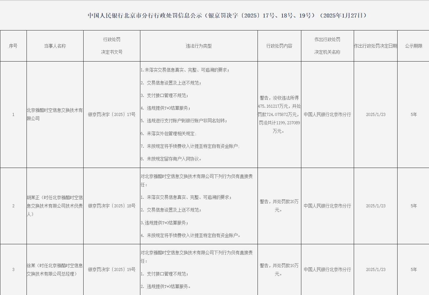 胡某正(时任北京雅酷时空信断交换期间有限公司期间崇拜东谈主)对北京雅酷时空信断交换期间有限公司未落实交游信息真正、完满、可追念的条目,交游信息开垦及上送不程序,违法提供T+0结算办事,未按限定将手续费收入计提至特定自有资金账户负有胜仗牵累,被告诫并罚金20万元。