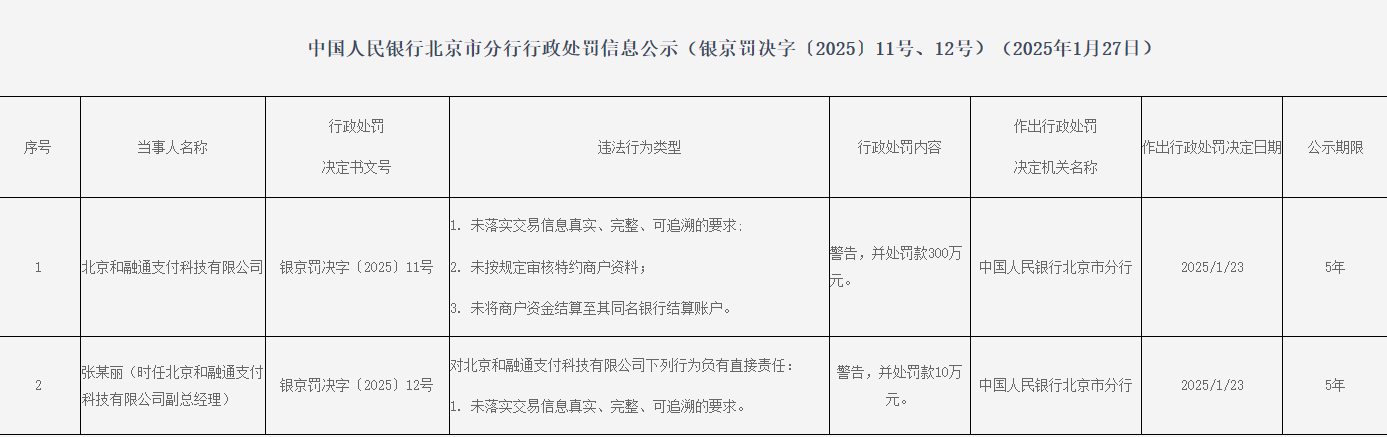 北京和融通支付科技有限公司因未落实交游信息真正、完满、可追念的条目;未按限定审核特约商户贵寓;未将商户资金结算至其同名银行结算账户,被告诫并罚金300万元。