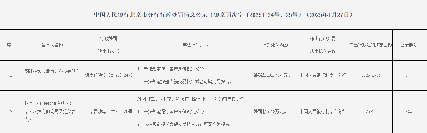 网银在线(北京)科技有限公司因未按限定实践客户身份识别义务、未按限定报送大额交游讲演粗略可疑交游讲演,被罚金101.73万元。