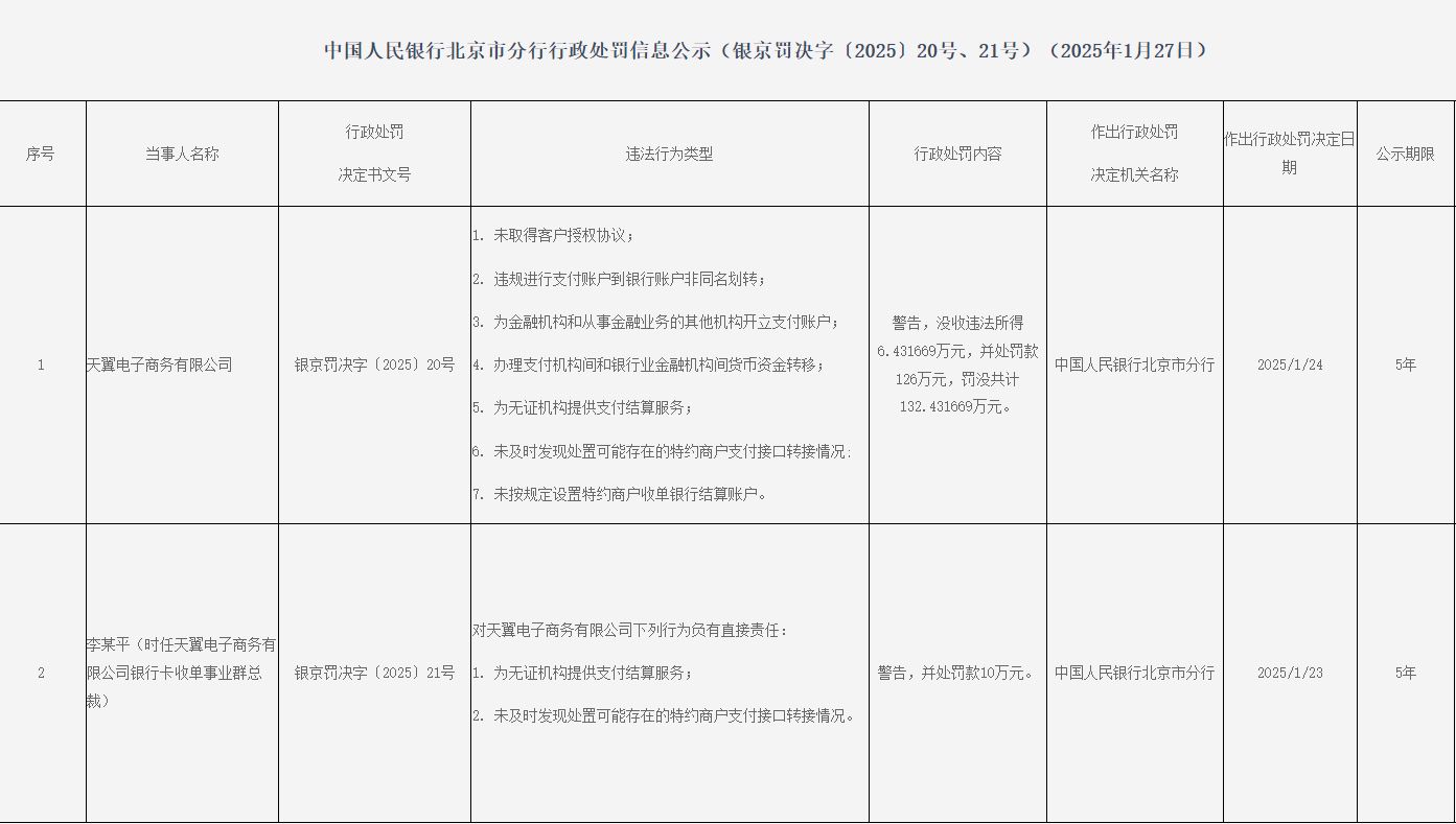 天翼电子商务有限公司因7项违法行径,被告诫,充公违法所得6.431669万元,并处罚金126万元,罚没统共132.431669万元。罚单触及违法行径类型如下:1. 未获得客户授权合同;2. 违法进行支付账户到银行账户非同名划转;3. 为金融机构和从事金融业务的其他机构开立支付账户;4. 办理支付机构间和银行业金融机构间货币资金回荡;5. 为无证机构提供支付结算办事;6. 未实时发现处理可能存在的特约商户支付接口转接情况;7. 未按限定开垦特约商户收单银行结算账户。
