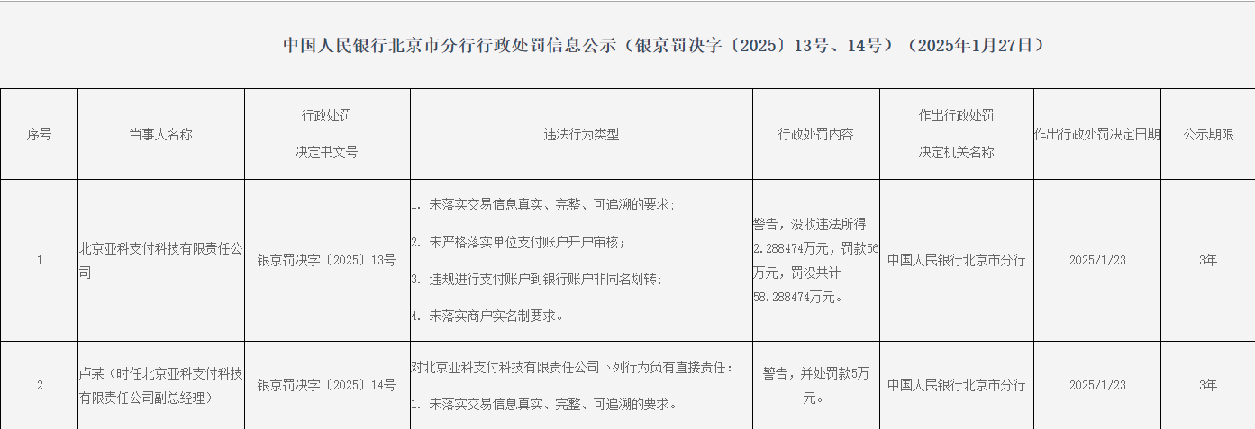 卢某(时任北京亚科支付科技有限牵累公司副总司理)对北京亚科支付科技有限牵累公司未落实交游信息真正、完满、可追念的条目负有胜仗牵累,被告诫,并处罚金5万元。